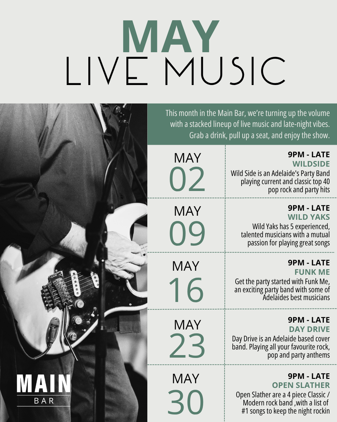 Saturday nights at the Main Bar are all about live music, and May is no exception. We’re turning up the volume with a stacked lineup of talented bands bringing everything from classic rock and pop anthems to high-energy party hits.
