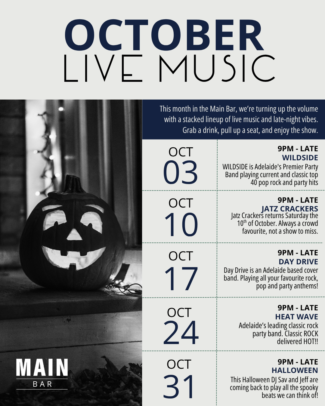 October brings a full month of live music to the Main Bar, building week by week towards one of the biggest nights of the year—Halloween.