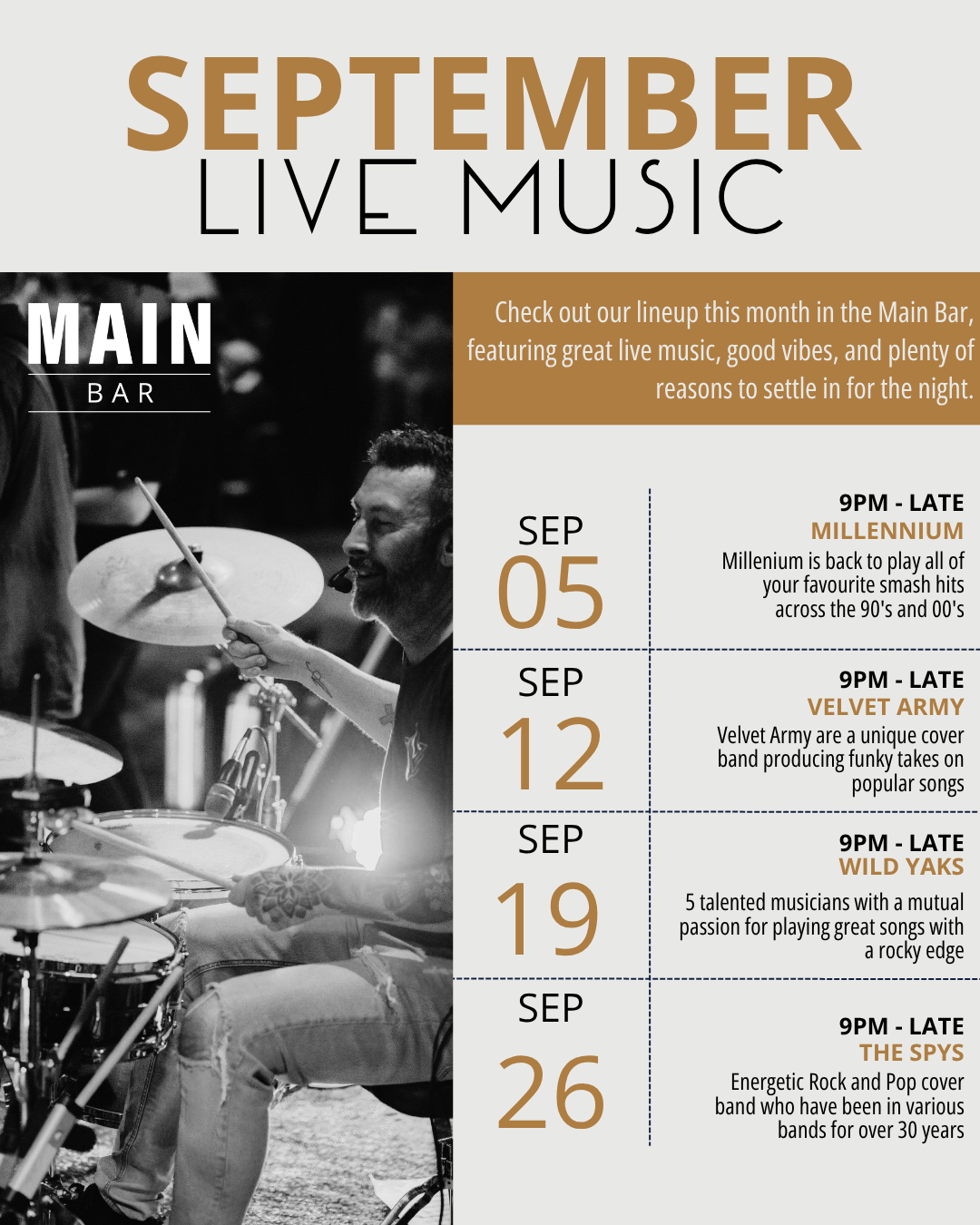 September keeps the energy high in the Main Bar, with another month of live music set to bring the atmosphere to life every Saturday night. From nostalgic 90s and 00s hits to funk-inspired covers and rock favourites, the lineup delivers something for every kind of crowd.